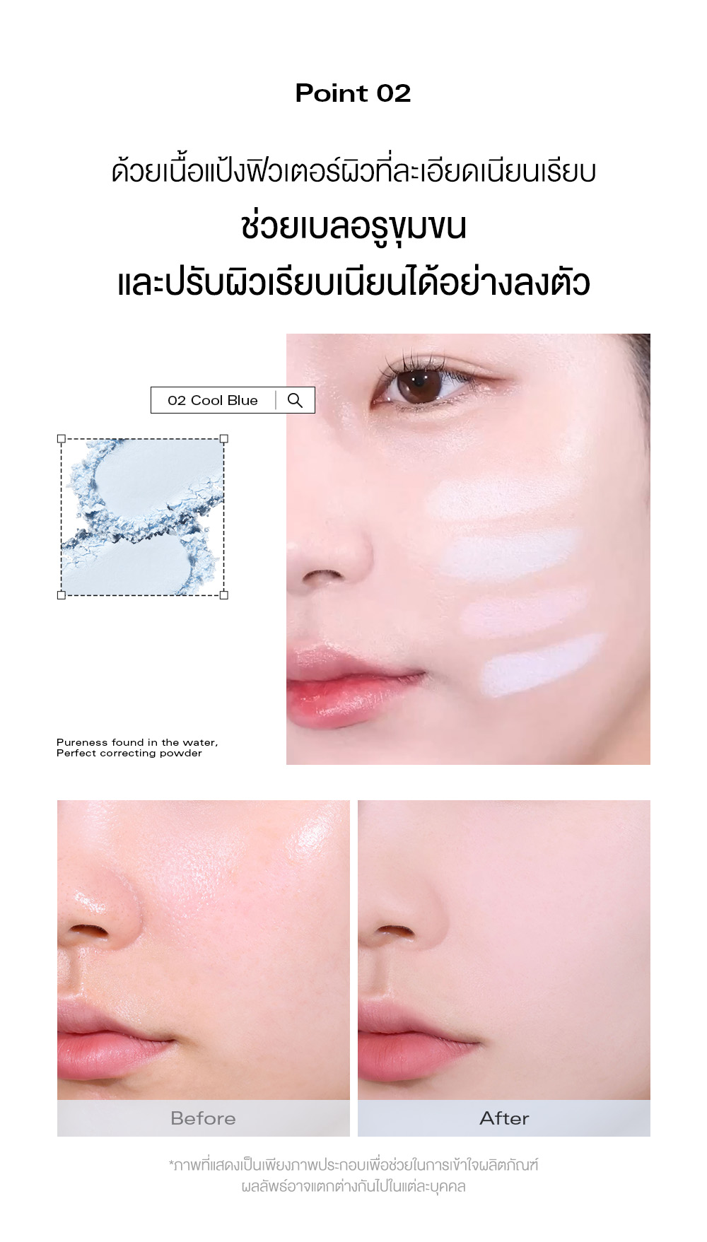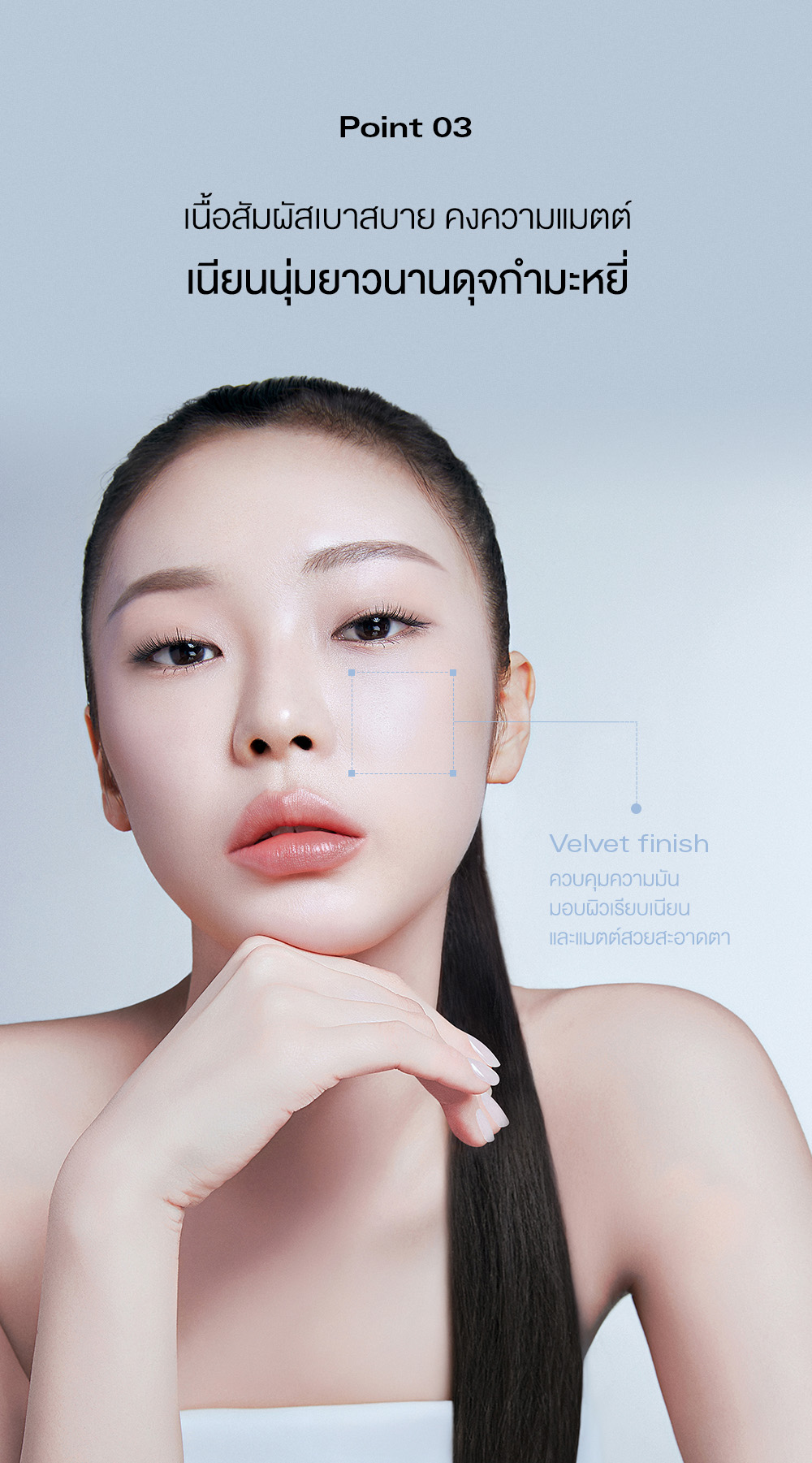 🌬️ เนื้อบางเบา – ให้สัมผัสเบาสบายผิว ไม่หนักหน้า ไม่ตกร่อง แม้เติมระหว่างวัน